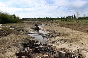 Der Weiher wird ausschließlich vom Grundwasser gespeist, überschüssiges Wasser wird in den Drosbach abgeleitet, wobei die Bezeichnung „Bach“ momentan sehr übertrieben ist. Rinnsal dürfte es wohl eher treffen, da die Trockenheit der vergangenen Wochen diesem bereits stark zugesetzt hat. Rechts und links davon sind ebenfalls Moorbereiche geplant.