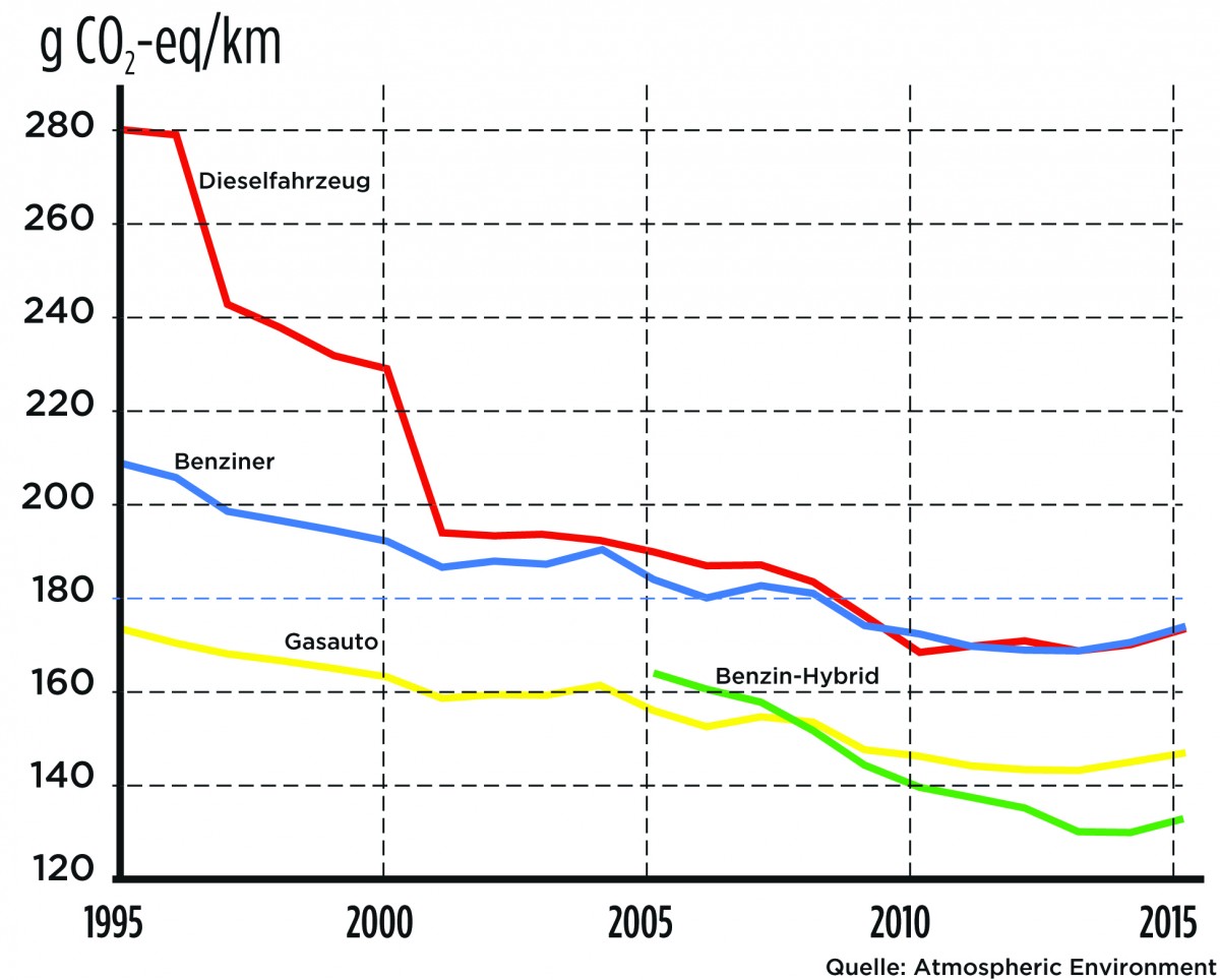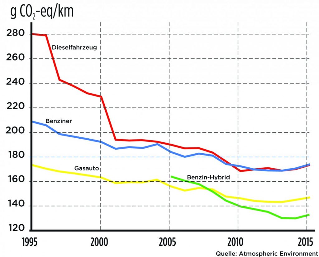 Doch eine neue Studie widerlegt diese Auffassung: Diesel und Benziner produzieren pro Kilometer gleich viel klimaschädliches Kohlendioxid. Forscher um Tim Butler vom Potsdamer Institute for Advanced Sustainability Studies haben dafür die Realverbrauchswerte zwischen 1995 und 2015 verglichen. Das Ergebnis: „Der europäische Dieselboom scheint nicht effizient gewesen zu sein bei der Reduzierung von klimaschädlichen Emissionen.“ Zu den Gründen zählen die Forscher neben dem hohen Realverbrauch auch das höhere Gewicht der Dieselflotte. Das ernüchternde Fazit: Die Klimafreundlichkeit des Diesel ist ein „Mythos“, Europa habe auf die falsche Technologie gesetzt.