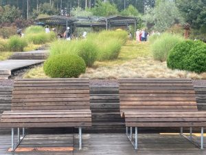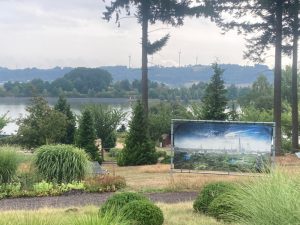 Der Pavillon des Gartens ist beliebt dafür. Durchschnittlich 50 Paare geben sich hier jährlich das Ja-Wort. Zwischen den Pflanzen stehen die Fotos des in Metz lebenden Künstlers und Zukunftsforschers Yannick Monget. Der Klimawandel und seine Auswirkungen sind seine Themen, denen er in dem Projekt „Welten der Zukunft“ nachgeht. Die grafisch nachbearbeiteten großformatigen Tableaus zeigen Hoffnungsschimmer und Apokalypse zugleich.