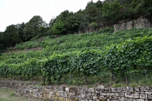 Ein bisschen weiter öffnet der Wald sich plötzlich und gibt den Blick frei auf einen Weinberg, den hier niemand vermutet. Bis 1957 wurde dort Wein angebaut, dann standen schnell wachsende Fichten auf dem Hang. 1999 werden sie auf Anregung des Umweltministeriums gerodet und wieder Rebstöcke angebaut. Die Cuvée aus Pinot Gris und Auxerrois, die die Trauben des 35 Ar großen Geländes seitdem liefern, kreiert heute niemand anderes als Aby Duhr aus Grevenmacher.
