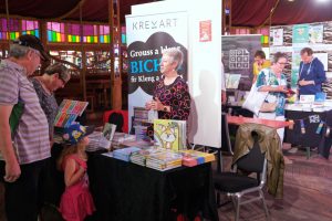 Am Montag war Tag der Luxemburger Buch-Verlage. Alle waren dort. Mit Eins-a-Vertretern. Einmal mehr konnte man sich als Besucher bewusst werden, wie viele Verlage und – ja, natürlich Bücher „made in Lëtzebuerg“ es gibt. Bei sommerlichen Temperaturen, im Zelt, aber auch draußen, fast schon tropisch, zeigten alle Teilnehmer, was sie im Repertoire haben.