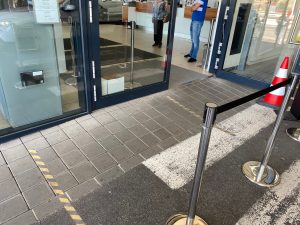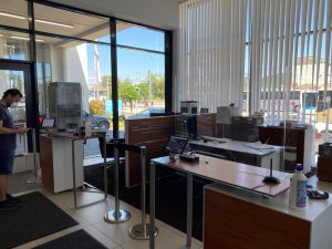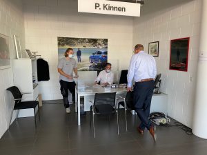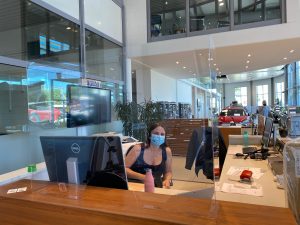 Als der Lockdown Mitte März in Kraft trat, reagierte BMW Schmitz schnell, stoppte alle Aktivitäten in den Ausstellungsräumen und hielt nur noch einen Notdienst aufrecht. Sofort wurden zudem Sicherheitsmaßnahmen ergriffen, um das Personal und die wenigen Kunden, die noch nach Mersch kamen, zu schützen. „Fast alle diese Maßnahmen haben auch nach der Lockerung noch Bestand“, erklärt Bernd Fuhrmann, der Direktor von BMW Schmitz. Vor der Tür wurden Markierungen angebracht, die garantieren sollen, dass jeder sich an den vorgeschriebenen Sicherheitsabstand von zwei Metern hält. Am Eingang und an den Service-Theken kann man seine Hände desinfizieren. Sogar Handschuhe stehen zur Verfügung. Nur eine begrenzte Zahl an Kunden wird im Empfangsraum geduldet. Ein „Guide“ dirigiert die Kunden zu den richtigen Theken.