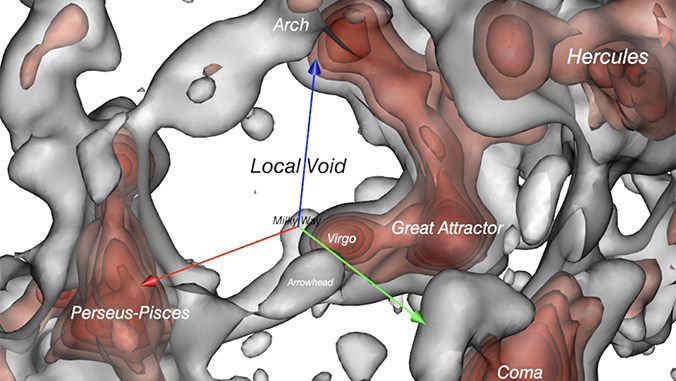 Vor 32 Jahren entdeckten Tully und sein Kollege Rick Fischer in der Nachbarschaft der Milchstraße eine gewaltige Ausdehnung, die kaum Materie enthält, die fast leer ist. Sie wird in der Fachsprache als „Lokale Leere“ oder „Local Void“ bezeichnet. „Vielleicht war das im ersten Moment überraschend, aber eigentlich ist es nicht verwunderlich, dass so etwas hier existiert“, sagt Tully. Der Grund dafür ist die Gravitation. Galaxien ziehen sich gegenseitig an und halten sich gerne in Gruppen auf. Diese Galaxienhaufen bilden wiederum Supergalaxienhaufen und diese wiederum bilden lange unförmige Ketten, die sich durch das Universum schlängeln – sogenannten Filamente. Die Hohlräume zwischen den Filamenten werden als „Leeren“ oder „Voids“ bezeichnet und es gibt sie überall im Universum.