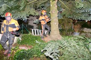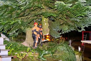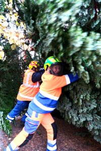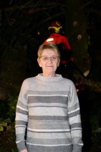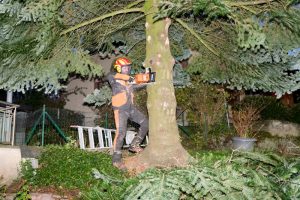 Die Besitzerin des Grundstücks, Rita Pleim-Zurek, steht am Rand des Gartens und schaut dem Treiben zu. „Der Baum war schön“, sagt sie ruhig. „Wir haben ihn vor fast vierzig Jahren gepflanzt.“ Dann zögert sie kurz. „Aber die Sicherheit geht vor.“ Vor einer Weile hatte sie einen Wasserschaden im Haus, genau dort, wo die Wurzeln des Baumes hinwachsen. „Das wurde zumindest vermutet. Außerdem ist er so hoch, dass ich bei Wind immer Angst habe, dass er irgendwann aufs Haus fällt“, sagt sie. Die Fällarbeiten des Service Parcs sind für die Familie kostenlos. Es ist ja schließlich für den guten Zweck.