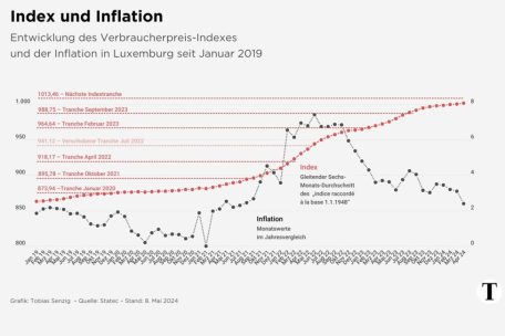 Hintergrund der erwarteten höheren Preissteigerungsrate hierzulande ist das Auslaufen der staatlichen Stützungsmaßnahmen im Energiebereich zu Jahresbeginn 2025. Ohne zusätzliche Maßnahmen prognostiziert Statec für 2025 einen Anstieg der Gas- und Strompreise um 17 beziehungsweise 60 Prozent. In dem Fall würde im dritten Quartal 2025 eine weitere Indextranche fallen.