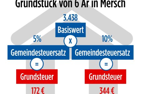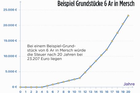 Auch die neue Mobilisierungssteuer stammt in ihren Grundzügen aus dem Gesetzesentwurf von Bofferding. In den ersten vier Jahren nach Inkrafttreten des Gesetzes fällt keine Steuer an, diese wird erst ab dem fünften Jahr erhoben. Je länger das Grundstück unbebaut bleibt, desto höher steigt der Steuersatz – so lange, bis ein Rohbau auf dem Grundstück fertiggestellt ist. Berechnet wird die Steuer mithilfe des oben genannten Basiswerts des Grundstück. Ab fünf Jahren sind 0,05 Euro pro Punkt fällig, ab elf Jahren 0,75, ab 16 Jahren 2,5 und ab 20 Jahren 4,5 Euro. Für ein Grundstück von sechs Ar in Mersch würde eine 20-jährige Brache den Eigentümer pro Jahr 23.207 Euro kosten.