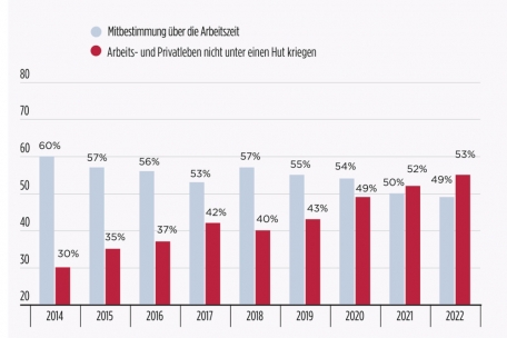 2022 traf dies schon auf 55 Prozent zu. Das gilt sowohl für Alleinstehende, bei denen der Wert 2022 steigt, als auch für Familienväter und -mütter und Paare. Die privaten Umstände sind sehr unterschiedlich, aber eine Ursache für die Dysbalance scheint im Berufsleben zu liegen. Der „Quality of Work Index“ weist aus, dass die Zufriedenheit am Arbeitsplatz zwischen 2014 und 2022 kontinuierlich abnimmt.