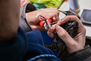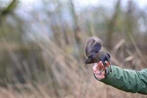 Gerade bringen freiwillige Helfer Vögel in kleinen Stofftaschen in den Bauwagen. Jeder der federleichten kleinen silbernen Ringe mit den eingravierten Ziffern ist individuell und funktioniert wie ein Pass. Über die Kennzeichnung gelingt es, Bestände zu überprüfen und Lebensgewohnheiten der Vögel zu erforschen.