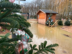 Auch Holzstände des bereits beendeten Weihnachtsmarktes in dem Park stehen zum Teil unter Wasser. Sie werden noch einige Zeit stehen bleiben, bis sie wieder trocken sind.
