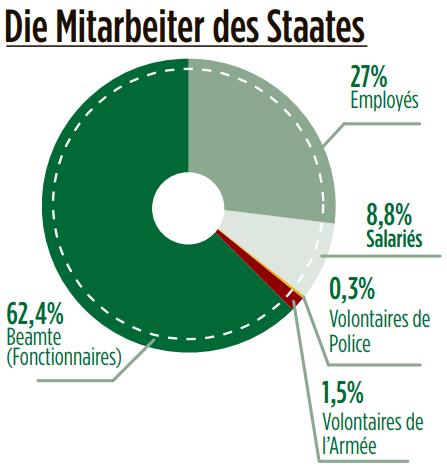 Die allermeisten dieser Mitarbeiter (62,4 Prozent) sind Beamte („Fonctionnaires“). Hinzu kommen die Angestellten („Employés“ und „Salariés“), die Soldaten im Freiwilligendienst und die Volontäre der Polizei.
