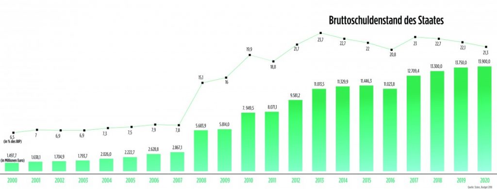 Beim Zentralstaat jedoch liegen die Ausgaben über den Einnahmen. Laut Budget 2018 soll das Saldo in diesem Jahr bei -890 Millionen Euro liegen. Doch schon im Jahr 2021 soll sich das Defizit auf -89 Millionen Euro verkleinern.