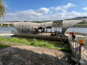 Der Ponton in Schengen ist Geschichte. Kurz vor Mittag am Freitag ist der Koloss aus dem Wasser gehoben und auf die Esplanade gesetzt worden. Dem vorausgegangen waren viele abwägende Diskussionen und Wochen der Vorbereitung. Zunächst wurde die schwimmende Tourist-Infostelle im Dreiländereck an der Mosel geräumt. Dann wurde nach und nach der Aufbau abgetragen. Die letzten Stücke sind am Freitagmorgen entfernt worden. Ein Heer von Arbeitern war über Tage damit beschäftigt, Teile zu zerschneiden und abzutransportieren. Am Freitagnachmittag ist dann damit begonnen worden, das Schwimmdock in drei Stücke zu teilen.