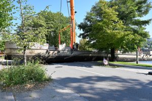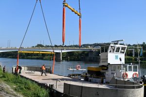 Kurz vor Mittag wurde der Ponton in Schengen aus dem Wasser gehievt Foto: Editpress/Claude Lenert