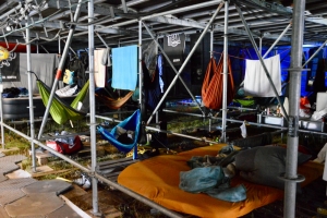 Wahrlich ein Knochenjob, den die 60 Männer und Frauen des „Golden Teams“ da in Schichten absolvieren müssen. An Ruhepausen zwischendurch ist kaum zu denken. Der einzige Zeitpunkt, an dem die Roadies nicht arbeiten müssen, ist während der Konzerte selbst. Deshalb legen sie sich während der Gigs in ihre unter der Bühne befestigten Hängematten und gönnen sich eine Mütze Schlaf. Doch ob man wirklich schlafen kann, wenn über einem Brian Molko – von Marshall-Türmen und knapp 100 Dezibel verstärkt – in die Saiten drischt, ist natürlich fraglich.