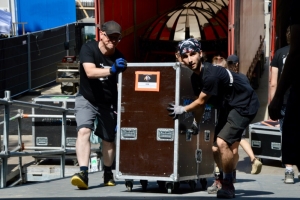Der sieht am ersten Morgen folgendermaßen aus: 7 Uhr, Ankunft Truck der Black Eyed Peas; 11 Uhr, Ankunft der drei Trucks von Louise Attaque; 15 Uhr, Ankunft Truck von Adekunle Gold. Man arbeitet sich von hinten nach vorne vor. Das Material des Headliners wird ganz hinten im Bühneninnern verstaut, das desjenigen, der am Abend als Zweiter dran ist, davor und das Zeug des Künstlers, der den Festivaltag eröffnet, im vorderen Teil der Bühne. Auch für den anschließenden Soundcheck gilt diese Reihenfolge, damit der erste Act soundtechnisch sofort aus dem Vollen schöpfen kann.