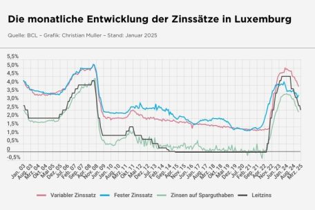 Laut neuen Zahlen der Luxemburger Zentralbank sind die durchschnittlichen Zinssätze für neue Immobilienkredite mit einem variablen Zinssatz im Januar 2025 erstmals seit März 2023 wieder unter vier Prozent (3,88 Prozent) gefallen.