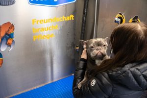 Nachdem ein paar Euro in der Anlage gelandet sind, kann der Hundebesitzer loslegen. Drei Waschmittel stehen zur Auswahl: Das normale Shampoo mit Conditioner, ein spezielles für weißes Fell – und ein Produkt, das Zecken- und Flohbefall vorbeugt. Mit einem Knopfdruck startet die Brause mit der ausgewählten Haarpflege. „Es ist wichtig für den Hund, dass das Shampoo ganz ausgespült wird“, rät Bastos. Nach dem Waschen kann der Hundefreund zum zweistufigen Föhn greifen. Für das kurze Fell der kleinen Französischen Bulldogge reicht zum Beispiel Stufe 1, die zweite Stufe ist für Langhaar-Hunde geeignet. „Der Föhn bläst kalte Luft, damit der Besitzer den Trockner direkt ans Fell halten kann“, erklärt Dogwash-Besitzer Bastos.