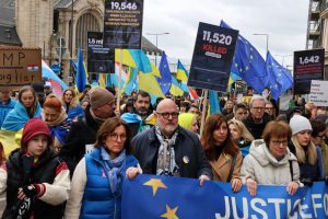 Etwa um 14 Uhr zieht der Tross von Demonstranten am hauptstädtischen Bahnhof los, zu dem die Organisation LUkraine unter dem Motto „Gerechtigkeit für Ukraine – Frieden für Europa“ aufgerufen hat. Es werden schätzungsweise um die 500 Teilnehmer sein. Viele tragen ukrainische Nationalflaggen, doch auch die Farben anderer europäischer Länder sind in dem blau-gelb-dominierten Fahnenmeer zu erkennen, vor allem die einiger mittel- und osteuropäischer Staaten, unter anderem aber auch skandinavische und die luxemburgische – und nicht zuletzt die Flagge der Europäischen Union.