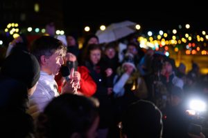 Der Arzt Benoît Ochs spricht vor der Philharmonie bei der „Marche blanche“ Foto: Anouk Flesch