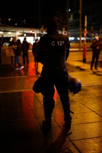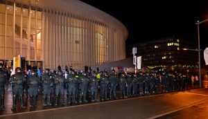 Die Polizei trennt die Gegendemo und die „Marche blanche“ vor der Philharmonie