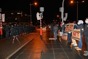 Zwischen den Straßenseiten flogen mehrfach Provokationen hin und her: Auf die per Megafon an die „Marche blanche“ gerichtete Forderung, doch bitte Masken aufzusetzen, regnete es Androhungen juristischer Klagen. Durch die von den Beamten der Polizei getrennten Protestgruppen blieb es aber bei den verbalen Attacken.