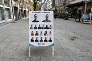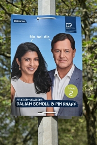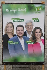 Mit der Doppelspitze Pim Knaff und Daliah Scholl geht derweil die DP ins Rennen um die Sitze im Gemeinderat. Beide dominieren auch die Wahlplakate der Partei, wobei ebenfalls Nicht-Kandidaten unter dem Slogan „No bei dir“ zu Wort kommen. Etwas sperrig kommt der Untertitel daher, der stets mit „Doheem“ beginnt und mit „Mir këmmeren eis drëm“ endet. Gleich vier Spitzenkandidaten haben „déi gréng“. Das Quartett Ragni, Pastoret, Kox und Sehovic wird unter dem Slogan „Mir schafen Zukunft“ präsentiert, wobei viele Plakate der Grünen mit Themen und nicht mit Kandidatenköpfen bedruckt sind. So werden u.a. mit lachender Mutter und Kind sichere Radwege gefordert.