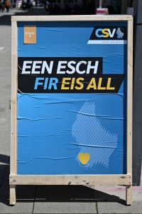 Auf die Karte Georges Mischo setzt man derweil bei der CSV. Der amtierende Bürgermeister steht auf den Wahlplakaten der konservativen Partei eindeutig im Vordergrund. Das erinnert ein wenig an „déi mam Juncker“ zum Beginn dieses Jahrtausends. Nur auf Esch gemünzt also „déi mam Mischo“. In der Alzettestraße wurden die ersten Plakate des Bürgermeisters bereits beschmiert. Damit das nicht überall passiert, haben fast alle Parteien ihre Poster recht hoch an den Pfosten der Stadt aufgehängt. Das ist wohl auch nötig, bietet z.B. der CSV-Slogan „Een Esch fir eis all“ doch recht offensichtlich Raum für ungewollte Manipulationen. Auf den Plakaten der CSV fällt außerdem die Luxemburg-Karte auf, mit einem orangen Herzen dort, wo Esch liegt.