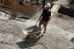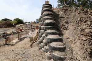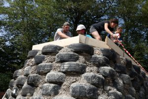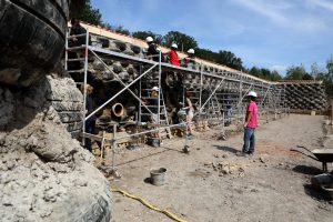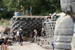 Die rund 30 Helfer, die auf der Baustelle zu 80er-Jahre-Soul und -Reggae mit Ewigkeitsgarantie Lehmmasse zwischen die Autoreifen füllen, haben Spaß. Sprachfetzen auf Spanisch, Deutsch und Englisch wabern über den Platz. Ein Bauleiter, der mit Plänen herumrennt und Anweisungen gibt, fehlt. Jeder weiß, was zu tun ist. Die Nord-, Ost- und Westwände für das 300 Quadratmeter große Gebäude stehen. In zwölf Reihen übereinandergeschichtet bilden die alten Reifen das Rückgrat der Konstruktion neben dem „Atert-Lycée“.