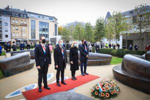 Großherzog Henri enthüllte am Sonntagmorgen gemeinsam mit Claude Wolf vom „Comité pour la mémoire de la Deuxième Guerre mondiale“ und Maisy Ginter-Bonichaux eine Gedenktafel am Hauptbahnhof in Luxemburg-Stadt. Die heute 96 Jahre alte Maisy Ginter-Bonichaux war eine der 3.614 jungen Frauen, die von den Nazis zwangsrekrutiert wurden. Die meisten von ihnen verließen Luxemburg über den Hauptbahnhof. 58 von ihnen starben in einem fremden Land. Der Großherzog und Premierminister Xavier Bettel legten auch einen Blumenkranz vor der Tafel nieder. Im Anschluss an die Zeremonie wurde eine Gedenkfeier auf dem „Kanounenhiwwel“ zelebriert. (Red.)