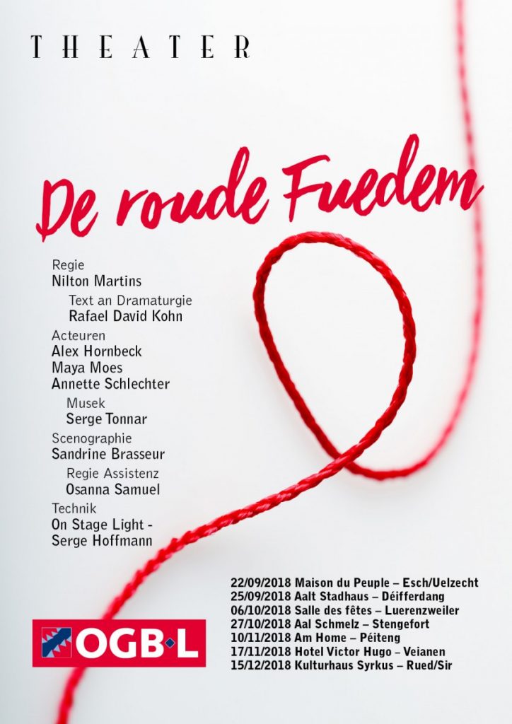 „De Roude Fuedem“ erzählt die Geschichte von Marco und Tania, einem kürzlich getrennten Pärchen – er nach langer Arbeitslosigkeit in der Probezeit bei der ADEM, sie eine schwer überarbeitete Altenpflegerin. Die Trennung verlief hässlich, Kohn analysiert hier präzise den Zusammenhang zwischen Arbeit und Selbstwertgefühl, und nun ist Tania auf seine Hilfe angewiesen, um den neuen Vertrag zu überprüfen, den ihr Arbeitgeber ihr aufdrängen will. Unfreiwillige Unterstützung auf ihrem Weg zum Widerstand gegen den Konzern, der das Altenheim betreibt, erhält Tania schließlich bei einer renitenten, alten Gewerkschafterin, die eine ihrer Patientinnen ist.