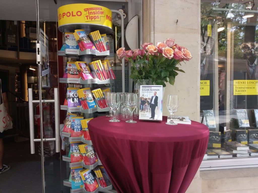 Meisch postiert sich neben einen hohen Tisch. Sein Buch liegt stapelweise neben ihm. In der Vitrine dahinter ist das Cover mit seinem Gesicht auf einem Poster zu sehen, auf dem für die Signierstunde geworben wird. Gläser sowie eine Flasche Schampus stehen für etwaige Besucher bereit.