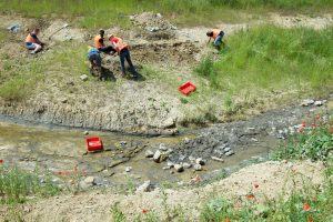 Trotz der glühenden Hitze kamen die Grabungen am Donnerstag gut voran, was auch an der durchsuchten Bodenschicht lag. So konnte das Team aus Freiwilligen und Mitarbeitern des MNHNL viele Knochenfragmente bergen. Um keinen Schaden anzurichten, mussten die Ausgrabungen ohne technische Hilfsmittel und lediglich mit Hacke und Spaten durchgeführt werden. „Es sieht nach nicht sehr viel aus, doch der Fund ist eine kleine Sensation. Überreste von so einem Saurier wurden bislang nur einmal in Deutschland gefunden. Zudem sind die Knochen sehr gut erhalten und müssen nicht weiter bearbeitet werden“, so der Paläontologe weiter.