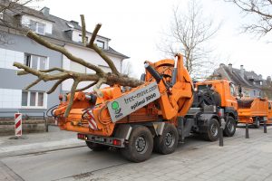 Am neuen Bestimmungsort angekommen, wird er in das vorher ausgegrabene Loch passgenau eingesetzt und steht, ohne dass dafür noch Korrekturen notwendig wären, gerade und fest. Knappe eineinhalb Stunden hat unlängst der Umzug des Baumes mit der Nummer 7 gedauert.