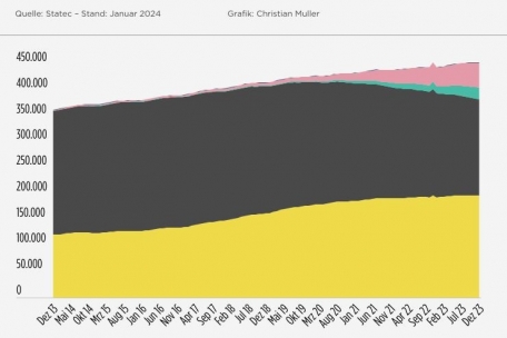 Trotz dieser beachtlichen Wachstumszahlen stehen die Elektroautos nach wie vor nur für einen sehr geringen Anteil an der Automobilflotte des Landes. Von den insgesamt 453.614 Autos, die im Dezember 2023 in Luxemburg angemeldet waren, lag der Anteil der Elektroautos bei nur 5,1 Prozent. Das sind insgesamt 23.267 Fahrzeuge (Vorjahr: 13.909). Im Dezember 2019 waren es lediglich 2.195. Die Zahl der hybriden Fahrzeuge stand im Dezember 2023 für 10,5 Prozent der Automobilflotte der Luxemburger.
