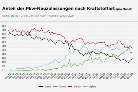 Am beliebtesten bleiben bei den Verbrauchern aber weiterhin die Benziner. Ihr Anteil an den Neuzulassungen war 2023, mit 33,2 Prozent, am bedeutendsten, ähnlich wie im Vorjahr. Jedoch ist auch ihr Anteil weiter rückläufig. Im Gesamtjahr 2022 lag er noch bei 34,6 Prozent. Mitte 2020 lag der Anteil bei über 45 Prozent der Neuzulassungen.