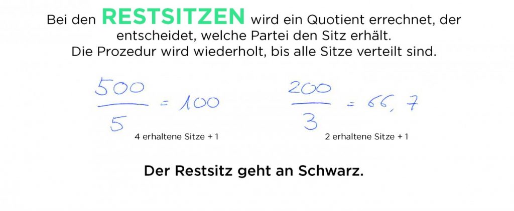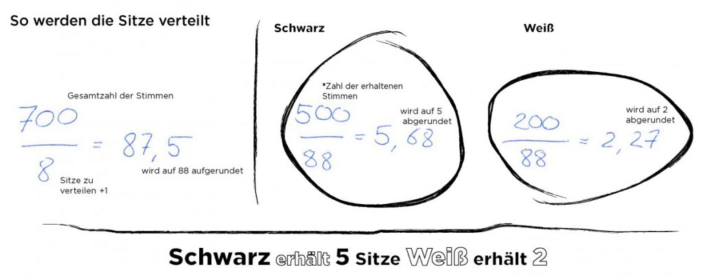 Kleines Gedankenspiel: Von den sieben Sitzen gingen nach der ersten Rechnung vier an „Schwarz“ und zwei an „Weiß“. Ein Sitz bleibt übrig. Um zu entscheiden, wer den Sitz bekommt, werden Quotienten errechnet. Die Zahl der Stimmen, die die Partei erhielt, wird durch die Zahl der bereits zugesprochenen Sitze + 1 geteilt. „Schwarz“ erhielt 500 Stimmen und 4 Sitze. 500 geteilt durch 5 (4+1) macht 100. Die Partei „Weiß“ erhielt 200 Stimmen und 2 Sitze. 200 geteilt durch 3 (2+1) macht 66,7. Der Sitz geht also an „Schwarz“.
