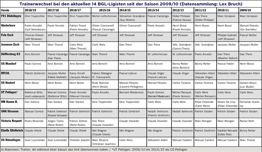 Der F91 entpuppte sich als Spitzenreiter in puncto Entlassungen. Seit 2010 hatten neun verschiedene Trainer das Kommando im Stade Jos. Nosbaum. Meister wurden die Düdelinger trotzdem meistens. Konstanz kehrte erst mit der Verpflichtung von Dino Toppmöller ein. Dicht hinter dem amtierenden Titelträger folgt Petingen (Fusionsverein Union Titus und davor der CS) mit acht Übungsleitern in den vergangenen zehn Jahren. Bei Rekordmeister Jeunesse gab es 2012/13 sogar drei Gesichter auf der Bank. Sébastien Grandjean wechselte während der Saison zu La Louvière (B) und Nachfolger Lionel Zanini wurde später durch Dan Theis ersetzt.