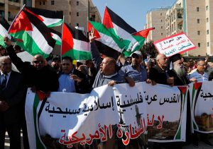 Auch in Ramallah im Westjordanland nahmen Tausende Palästinenser an einem Protestmarsch teil. Sie trugen palästinensische und schwarze Flaggen sowie Schlüssel. Damit wiesen sie auf ihre Forderung nach einer Rückkehr in die Gebiete hin, aus denen 1948 im Zuge der israelischen Staatsgründung Hunderttausende Palästinenser flohen oder vertrieben wurden. Demonstranten verbrannten US-Flaggen. Anschließend zogen Hunderte weiter zu Kontrollpunkten der israelischen Armee. Dort kam es nach palästinensischen Angaben zu Konfrontationen mit Sicherheitskräften, unter anderem in Kalandia und Bethlehem.