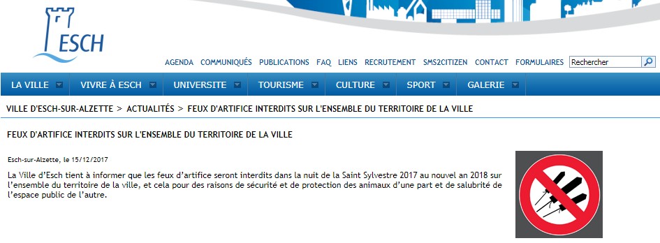 Die Stadt Esch verbietet dieses Jahr das Feuerwerk in der Silvesternacht. Das hat die Gemeindeverwaltung am Freitag auf ihrer Internetseite mitgeteilt. Aus Gründen der Sicherheit, des Tierschutzes und der Sauberkeit im öffentlichen Raum sei das Abfeuern von Feuerwerk auf dem gesamten Gebiet der Stadt Esch verboten.