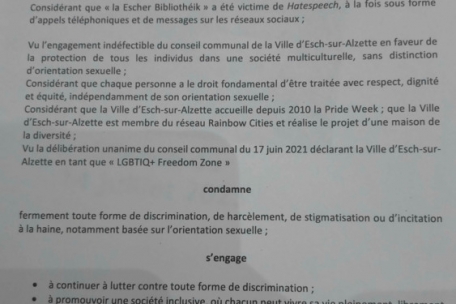 Die Motion spricht sich für den Schutz aller Individuen in einer multikulturellen Gesellschaft, unabhängig von ihrer sexuellen Orientierung, aus. Damit wolle die Gemeinde sich für die Schaffung eines Umfelds der Toleranz und Vielfalt einsetzen und für die Schaffung einer integrativen Gesellschaft, in der jeder sein Leben frei und ohne Angst vor Diskriminierung leben kann. Die Motion weist zudem darauf hin, dass Esch seit vielen Jahren Gastgeberin der Pride Week, Mitglied des Städtenetzwerks „Rainbow Cities Network“ und seit Juni 2021 ganz offiziell „LGBTIQ+ Freedom Zone“ ist.
