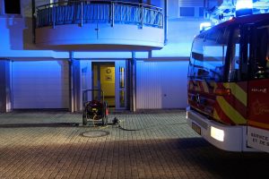 Das vierstöckige Mehrfamilienwohnhaus musste im Anschluss an die Löscharbeiten mittels eines Hochleistungslüfters ventiliert werden, um den Brandrauch und den Brandgeruch zu entfernen.