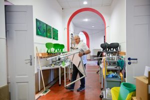 Etwas chaotisch sieht es auf den ersten Blick in dem Flur mit roten Bodenfliesen und weißen Wänden in der Escher „Brillschoul“ aus: Dreieckige Schulbänke stehen aneinandergereiht an der Mauer, Hausmeister Marco Kirsch hat darauf Stühle platziert. Ein Wagen mit den nötigen Utensilien zum Reinigen der Klassenzimmer ist zu sehen. „Zuerst müssen die Stühle raus, dann wird der Boden gewischt und gewachst. Gemeinsam mit dem Reinigungspersonal räume ich dann alles wieder alles rein. Sodass am Ende alles blitzblank ist“, erklärt der Mann aus Esch-Lallingen etwas mehr als eine Woche vor Unterrichtsbeginn bei einem Rundgang durch die Schule.