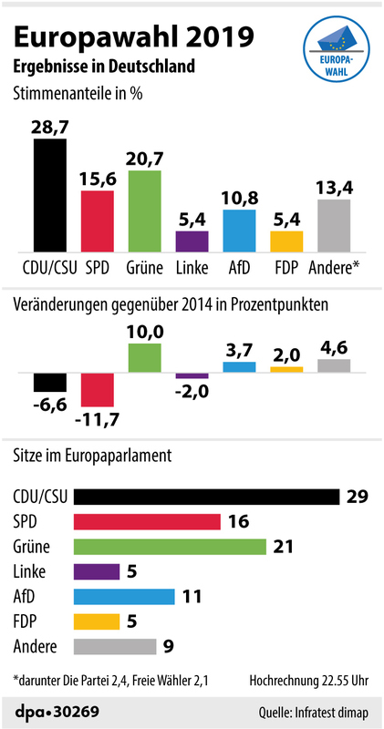 Nach den Europawahl-Hochrechnungen von ARD und ZDF für Deutschland (ca. 23.15 Uhr) bleibt die Union zwar stärkste Kraft, rutscht aber auf 28,4 bis 28,7 Prozent (EU 2014: 35,4 Prozent; Bundestag 2017: 32,9). Noch schlimmer ist das Ergebnis für die SPD: Sie wird mit 15,5 bis 15,6 Prozent nur noch Dritte (EU: 27,3; Bundestag: 20,5). Die Grünen verdoppeln mit 20,7 Prozent ihr EU-Ergebnis (10,7; Bundestag: 8,9). Die AfD bleibt mit 10,8 Prozent etwas unter den Erwartungen (7,1; Bundestag: 12,6). Die FDP fällt mit 5,4 bis 5,5 Prozent weit hinter ihr Bundestagsergebnis (3,4; Bundestag: 10,7). Die Linke schwächelt: 5,4 Prozent (7,4; Bundestag: 9,2).