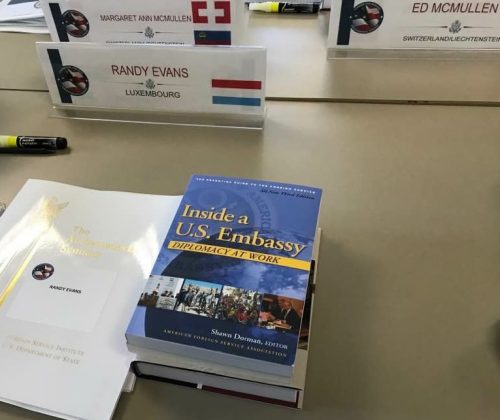 Auf Facebook postete der 58-Jährige schon vor einiger Zeit stolz Bilder aus seinem Diplomatie-Vorbereitungskurs. Das Seminar, das in Diplomatenkreisen offenbar auch “Benimmschule” genannt wird, wird vom amerikanischen Außenministerium für angehendes Botschaftspersonal veranstaltet. Auf seinem Schild prankte deutlich: „Randy Evans – Luxembourg“.