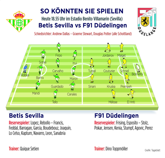 „Betis ist stärker als der AC Mailand“, schickt F91-Trainer Dino Toppmöller gleich voraus. Nach der 0:1-Niederlage gegen die Italiener erwartet die Düdelinger Underdogs am Donnerstag in Spanien eine ganz andere Partie. „Wir werden dem Ball sehr viel hinterherlaufen müssen. Nur wer physisch stark genug ist, wird morgen (am Donnerstag) auf dem Platz stehen“, sagt der deutsche Übungsleiter. Verzichten muss der F91 mit Sicherheit auf Stelvio da Cruz, der wegen einer Adduktorenverletzung in Luxemburg geblieben ist. Auch der ehemalige Metzer Verteidiger Milan Bisevac zählt nicht zum Aufgebot. Ihm fehlt noch immer der Rhythmus.
