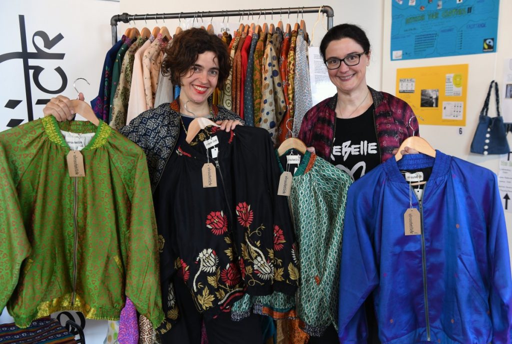 „Es sind recycelte Stoffe“, sagt Henn. Die in Indien übliche Sari-Borte veredelt die Jacken am unteren Rand und an den Taschen. „Einzelstück“ existiert seit einem Jahr. „Ich finde es wichtig, dass man Sachen nimmt, die es schon gibt“, sagt die Geschäftsfrau. „Die Stoffe haben eine Geschichte.“