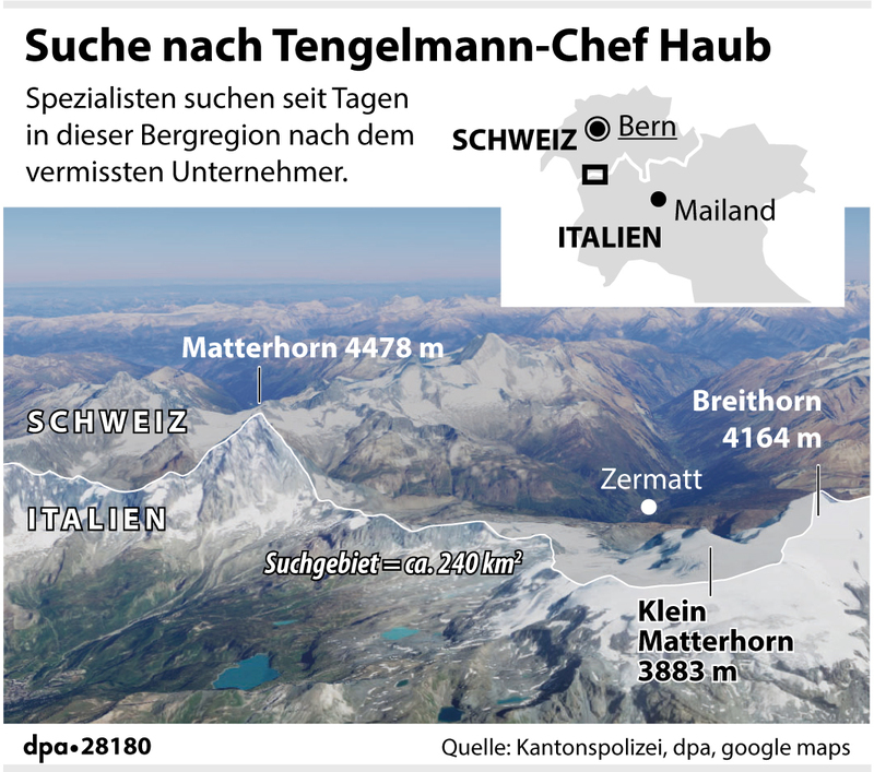 Haub (58) gehört zu den reichsten deutschen Unternehmern. Zu dem von ihm geleiteten Familienimperium gehören unter anderem Deutschlands größter Textil-Discounter Kik und die Baumarktkette Obi. Er war am Samstag allein zu einer Skitour auf den Berg Klein Matterhorn bei Zermatt aufgebrochen. An der Bergstation nahm eine Kamera noch sein Bild auf. Danach verliert sich seine Spur. Sein Handy war zu dem Zeitpunkt ausgeschaltet oder die Batterien waren leer. „Es ist wie die Suche nach einer Nadel im Heuhaufen“, sagte Truffer.