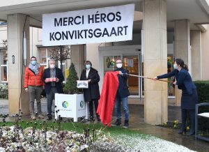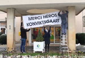 „Merci Héros Konviktsgaart“ prangt in großen Buchstaben auf dem drei Meter langen Banner, das die Familien der Bewohner am Eingang des Pflegeheims „Konviktsgaart“ in Luxemburg-Stadt aufgehängt haben. Sie wollen sich bei dem Personal des Heims bedanken. „Sie arbeiten Tag und Nacht seit dem Beginn der Pandemie“, heißt es in einem Presseschreiben.