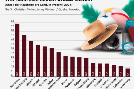 Die Unterschiede pro Land sind dabei gewaltig. Am schwersten haben es die Menschen in Rumänien. Mehr als die Hälfte der Bevölkerung (58,6 Prozent) können sich die Woche in einem Hotel oder auf einem Campingplatz nicht leisten. Auch im Urlaubsland Griechenland sind fast die Hälfte der Haushalte (46 Prozent) zu arm für eine Urlaubswoche. Bei über 40 Prozent der Bevölkerung liegt der Anteil auch in Bulgarien.