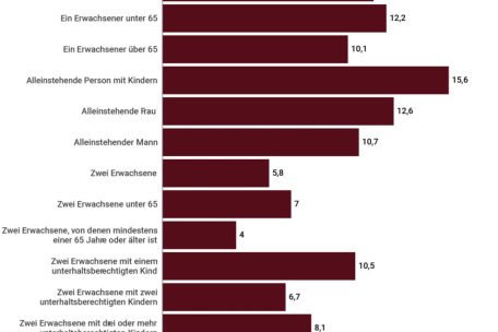 Große Unterschiede hat Eurostat derweil nicht nur zwischen den Ländern, sondern auch zwischen den unterschiedlich zusammengesetzten Haushalten gemessen. Besonders betroffen sind hierzulande demnach Alleinerziehende (15,6 Prozent) sowie alleinlebende Erwachsene, die jünger als 65 sind.